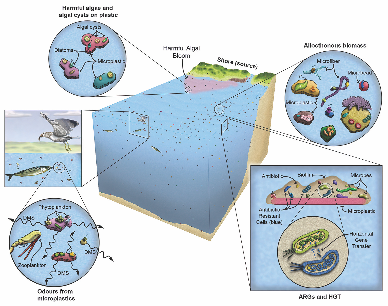 Plastic marine debris (PMD) is a global pollutant now found in every marine ecosystem globally. Predicted to dramatically increase over the next decade, PMD provides a surface for microbial colonization in areas where substrate surfaces are rare. Upon entering seawater, plastics are colonized by microorganisms on a scale of minutes, forming biofilms or plastisphere microbial communities. In this project, we explore the ecological roles of plastic-associated microbial assemblages in different areas: 1) the impacts of allochthonous biogenic factors in the plastisphere, such as non-indigenous species and antibiotic resistant genes, on the endemic ecosystem; 2) how biofilm biomass carried by plastics, as a foreign carbon source, influences the energy flux in marine ecosystems and factors determining the quality of epiplastic biomass and potential effects on the organisms that graze it.